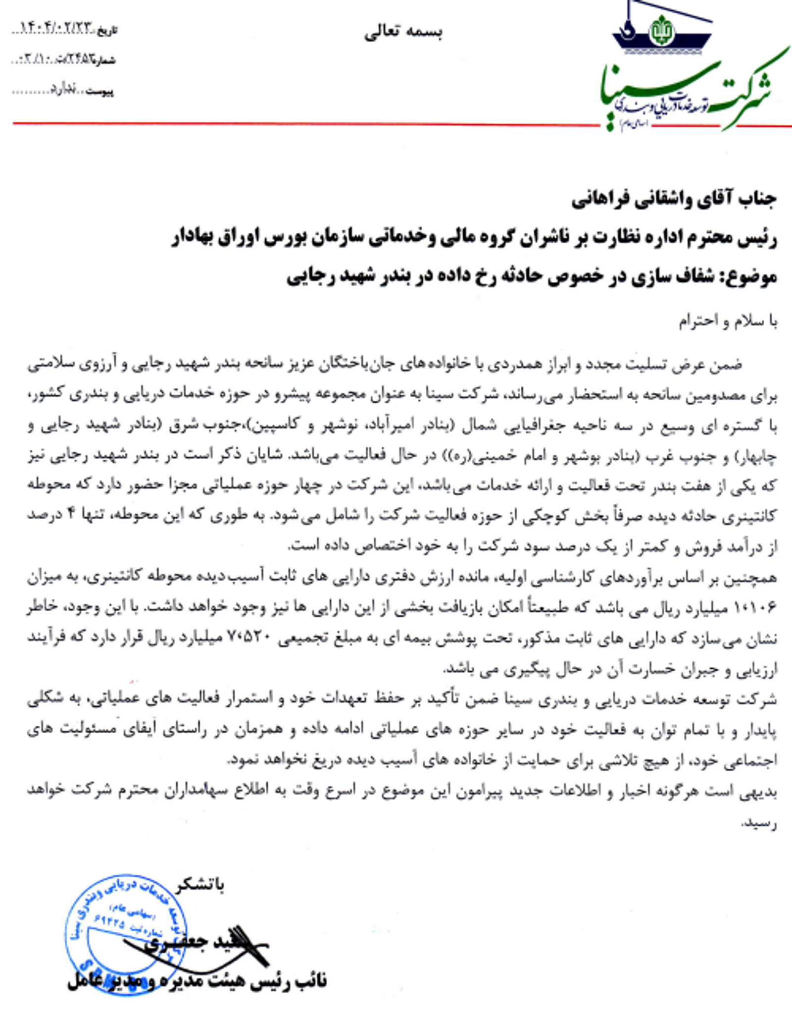 در این نامه تاکید شده شرکت سینا در شمال کشور در بنادر امیرآباد، نوشهر و کاسپین و در جنوب کشور در بنادر رجایی، چابهار، بوشهر و امام خمینی در حال فعالیت است.