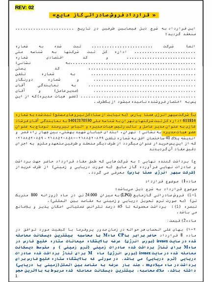 در سندی دیگر که پیشنویس یک قرارداد فروش گاز مایع است، شرکت سپهر انرژی همتا پارس بهطور مشخص نماینده ستاد کل نیروهای مسلح معرفی شده است.
