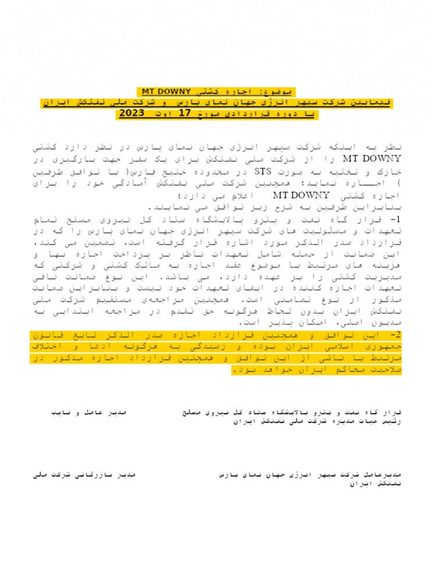همچنین در سندی دیگر که پیشنویس اجاره کشتی تحریمی Downy متعلق به شرکت ملی نفتکش ایران است، قرارگاه نفت و پتروپالايشگاه ستاد كل نيروى مسلح تمام تعهدات و مسوولیت شرکت سپهر انرژی جهاننمای پارس را تضمین میکند.