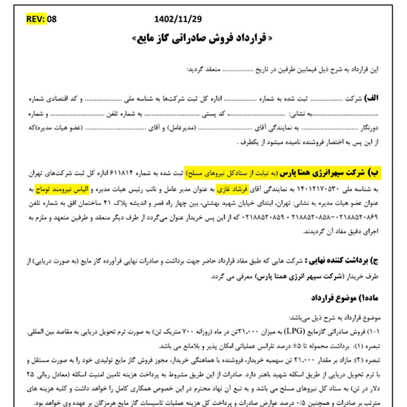 در پیشنویس تفاهمنامههای اجاره کشتی نیز نیروهای مسلح به وضوح تمام تعهدات و مسئولیتهای شرکت «سپهر انرژی جهاننمای پارس» را تضمین کرده است.