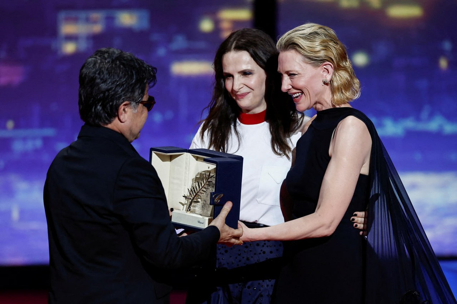 کیت بلانشت و ژولیت بینوش در حال گفت‌وگو با جعفر پناهی، پس از اهدای جایزه