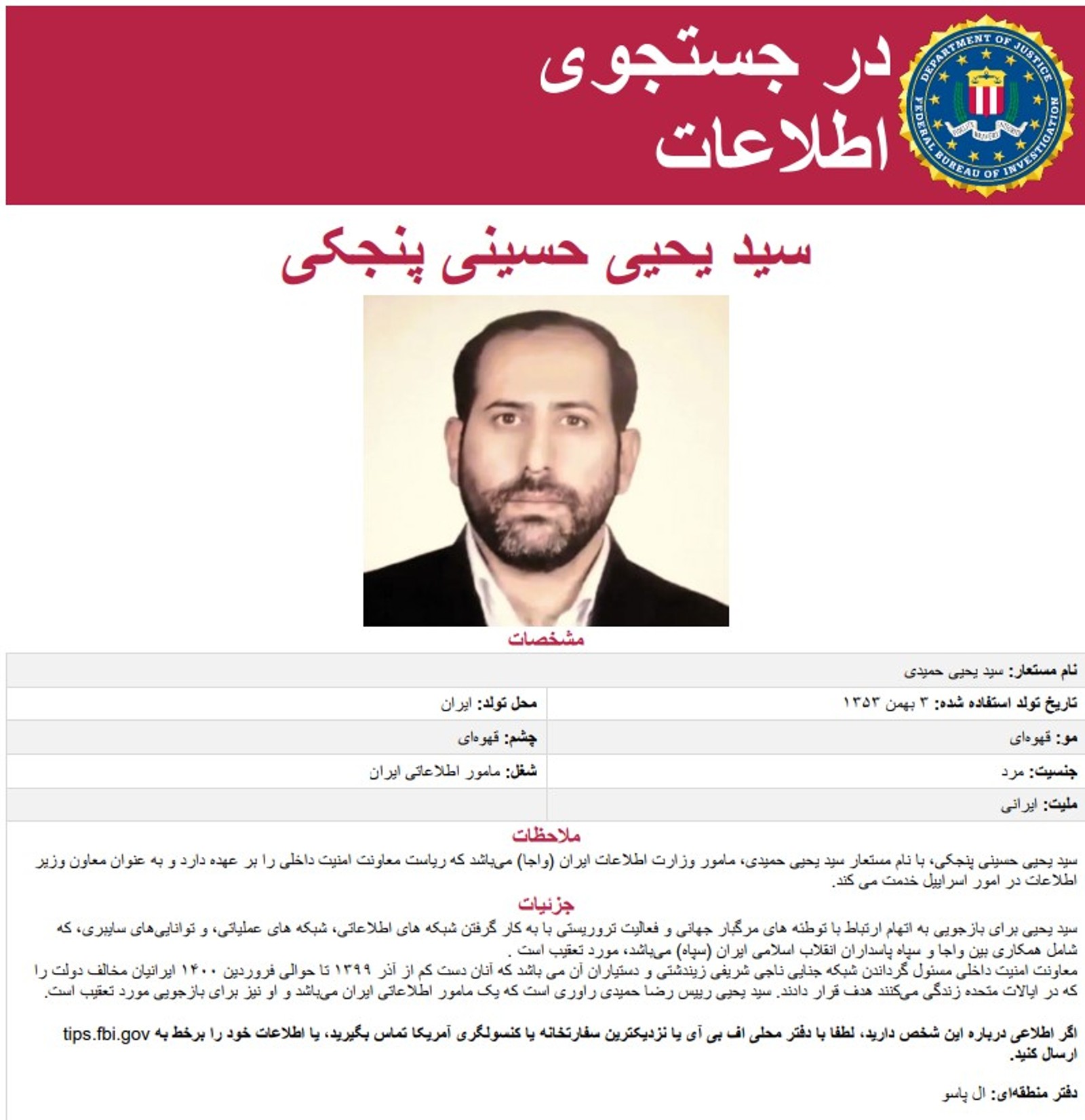 افبیآی: سیدیحیی حسینی پنجکی، معاون امنیت داخلی وزارت اطلاعات جمهوری اسلامی تحت تعقیب است