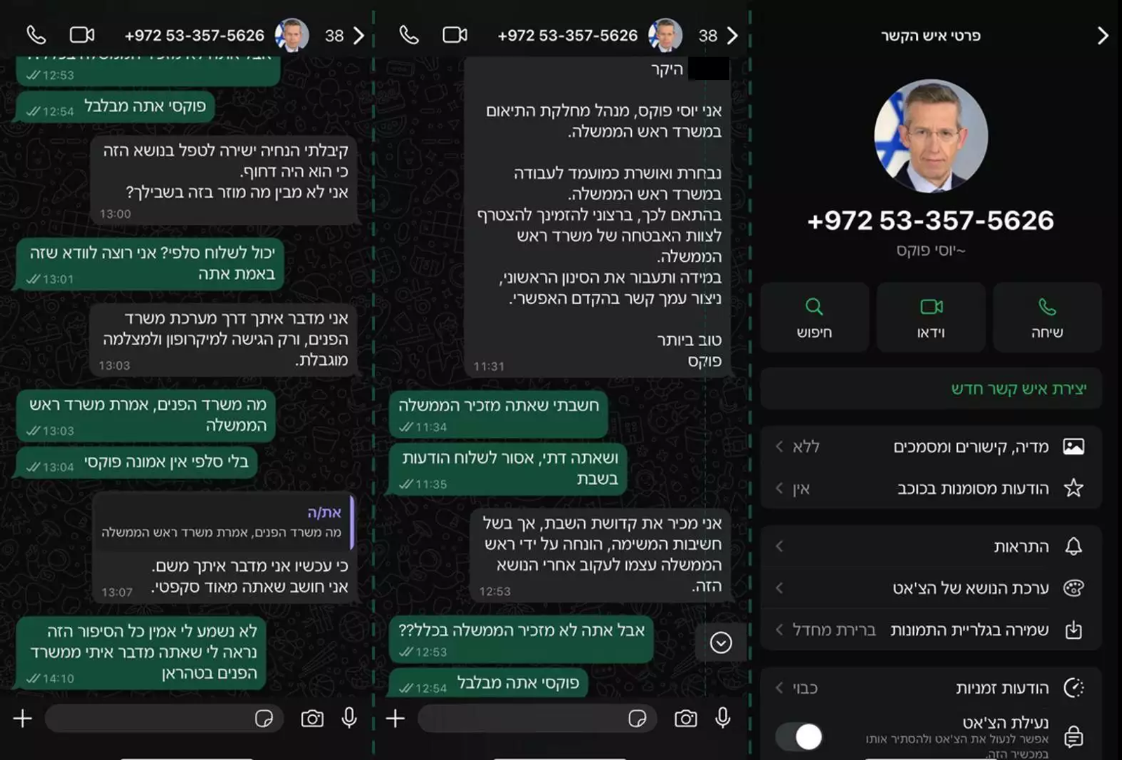 تصویری از تلاش یک عامل ایرانی با جعل هویت یوسی فوکس در گفت‌وگو با یک شهروند اسرائیلی