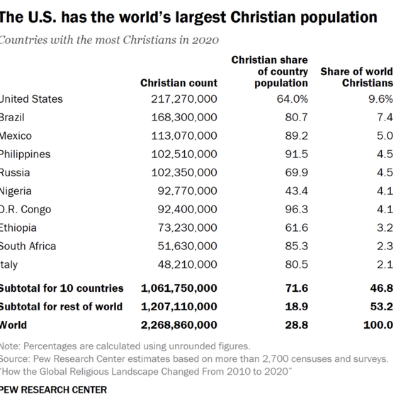 ایالات متحده همچنان میزبان بزرگترین جمعیت مسیحی در میان کشورهای جهان است؛ با حدود ۶۴ درصد از جمعیت این کشور که در سال ۲۰۲۰ خود را مسیحی معرفی کردهاند.