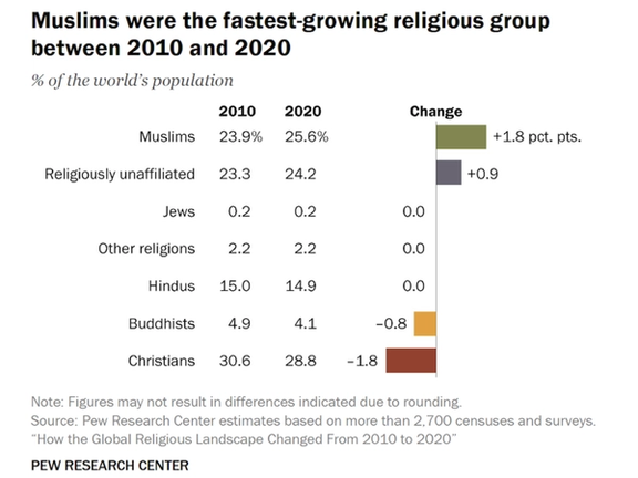 این در حالیاست که براساس این گزارش، جمعیت کلی جهان در همین دوره ۱۲ درصد افزایش یافته و جمعیت مسلمانان با رشد ۲۱ درصدی از ۱.۷ میلیارد به دو میلیارد نفر رسیدهاند.