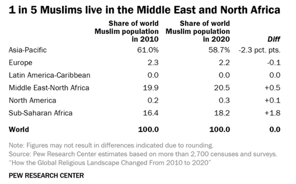 در منطقه آسیا-اقیانوسیه، سهم مسلمانان از جمعیت به ۲۶ درصد رسیده که نشاندهنده افزایش ۱.۴ واحد درصدی است. در اروپا، سهم مسلمانان به شش درصد و در آفریقای جنوب صحرا (آفریقای سیاه) به ۳۳ درصد افزایش یافته است.