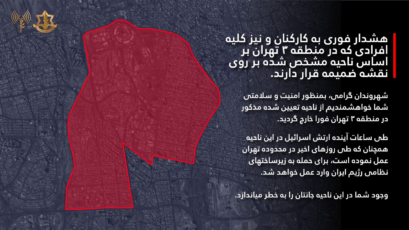 ارتش اسرائیل با انتشار اطلاعیهای هشدار داد که شهروندان حاضر در محدوده مشخصشده در نقشه ضمیمه، واقع در «منطقه سه تهران»، هرچه سریعتر این ناحیه را ترک کنند.