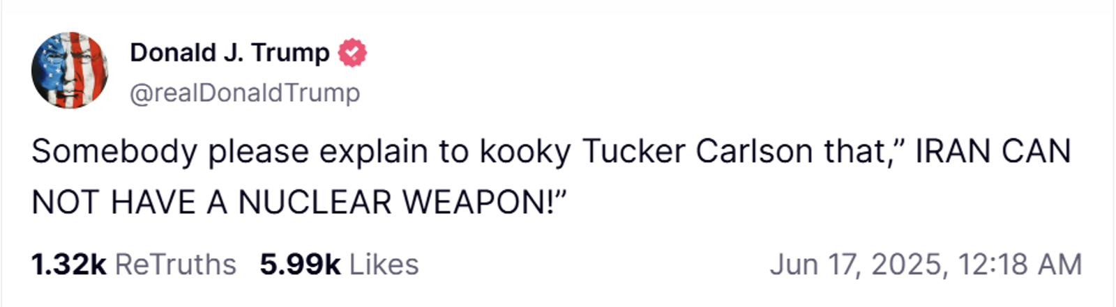 ترامپ عصر دوشنبه در شبکه اجتماعی خود، تروث سوشیال، نوشت: «ایران باید همان «توافقی» را که به آنها گفتم امضا میکرد. چه تاسفبار و چه جانهایی که هدر رفت. بهطور ساده بگویم: ایران نباید به سلاح هستهای دست پیدا کند. بارها و بارها این را گفتهام! همه باید فورا تهران را تخلیه کنند!»
