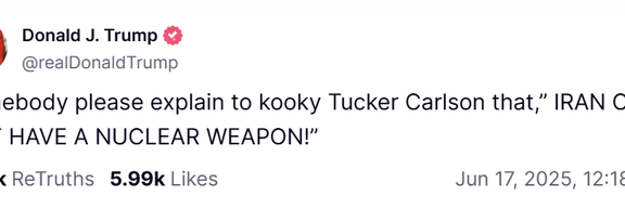 دونالد ترامپ رییس جمهور آمریکا در شبکه اجتماعی خود تروث نوشت: لطفا یک نفر به تاکر کارلسون دیوانه توضیح بدهد که: «ایران نباید سلاح هستهای داشته باشد!».