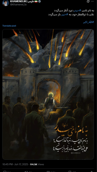 او در این پست نوشت: به نام نامی حیدر، نبرد آغاز میگردد، علی با ذوالفقار خود، به خیبر باز میگردد.