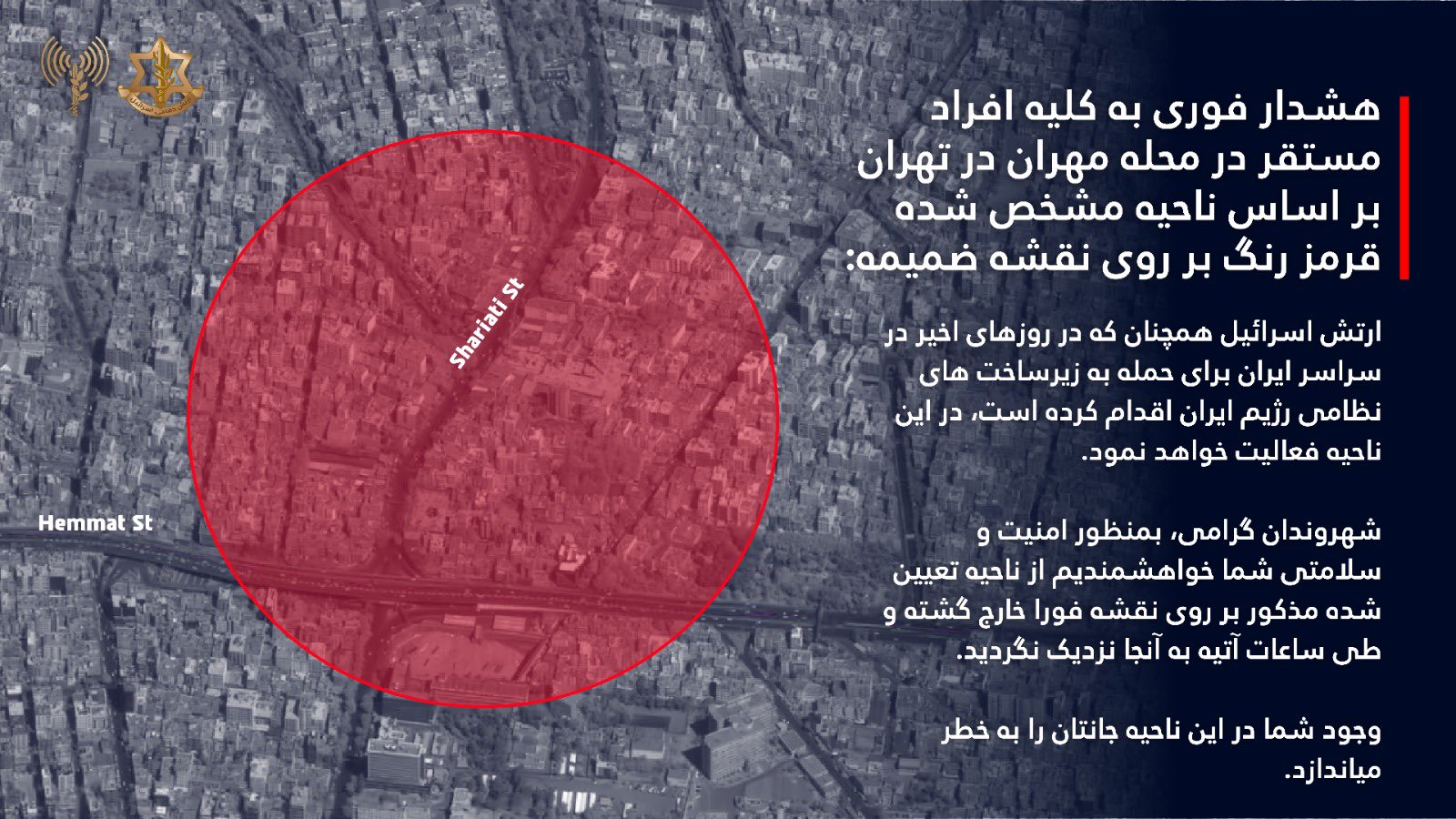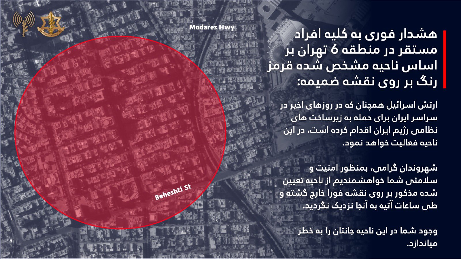 ارتش اسرائیل با صدور هشدار فوری از کلیه افراد مستقر در نواحی مهران و منطقه ۶ در تهران خواست، این منطقه را تخلیه کنند.