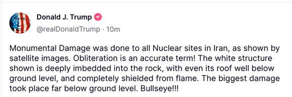 دونالد ترامپ، رییسجمهوری آمریکا، با اشاره به «آسیب بزرگی» که حمله آمریکا به سایتهای هستهای جمهوری اسلامی وارد کرده، با استناد به تصاویر ماهوارهای نوشت: «تخریب کامل اصطلاح کاملا دقیقی است.»