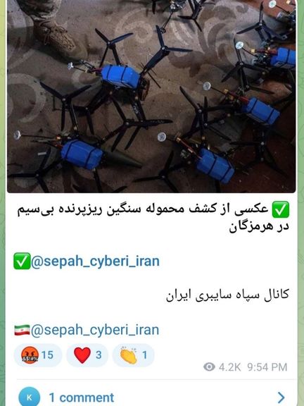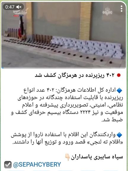 وزارت اطلاعات جمهوری اسلامی سوم تیر از توقیف ۴۰۲ پهپاد در دو شهر استان هرمزگان خبر داد. رسانههای حکومتی نیز در گزارش خود، تصویری از پنج پهپاد تهاجمی با باتریهای آبیرنگ منتشر کردند.