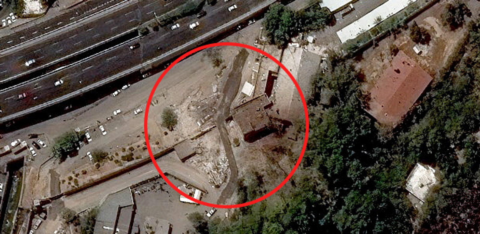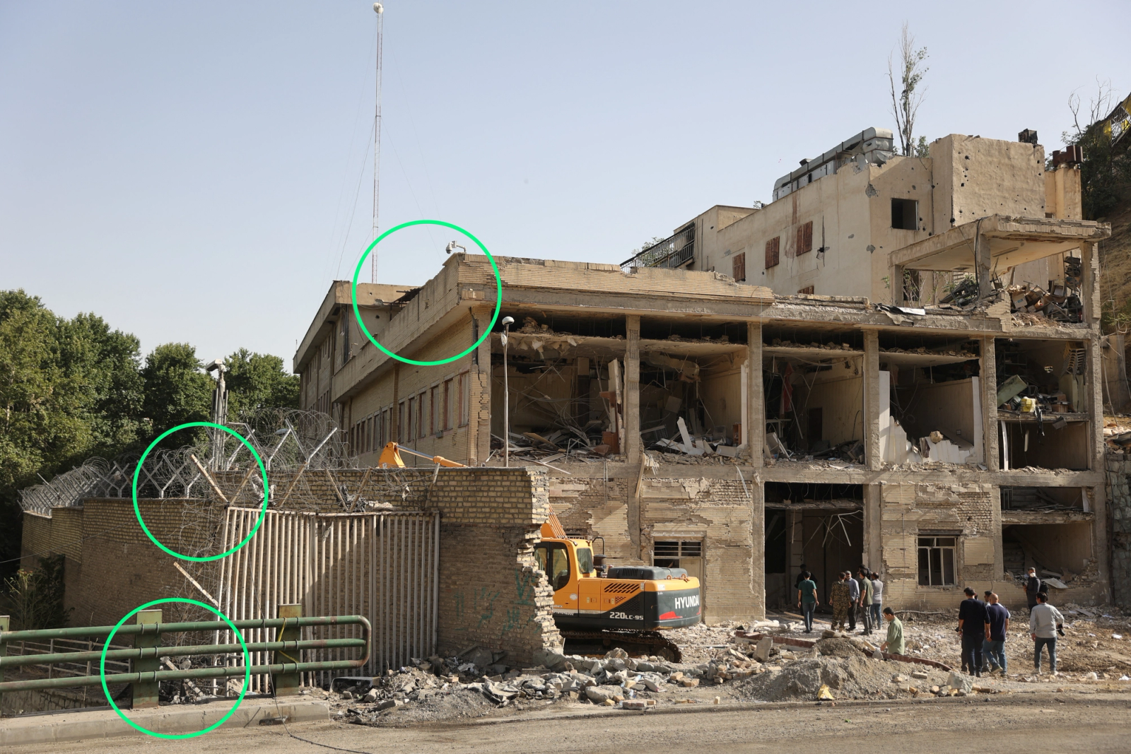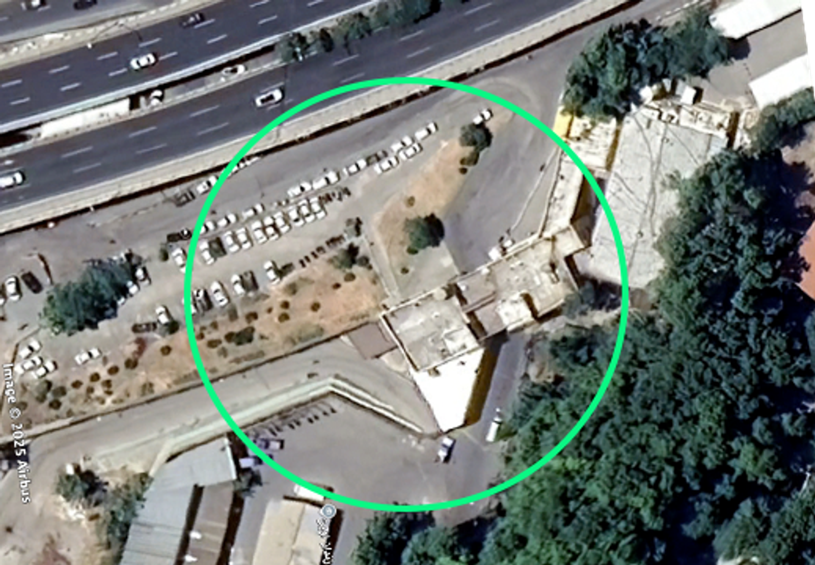 عکس زیر از گوگل‌مپ تهیه شده و مربوط به قبل از حمله اسرائیل است، برج دیده‌بانی با دایره سبز و ساختمان مسکونی با مستطیل سبز مشخص‌شده‌اند.