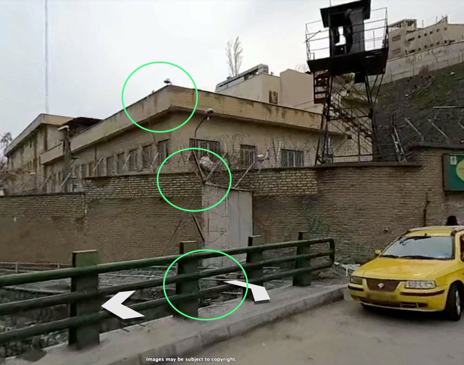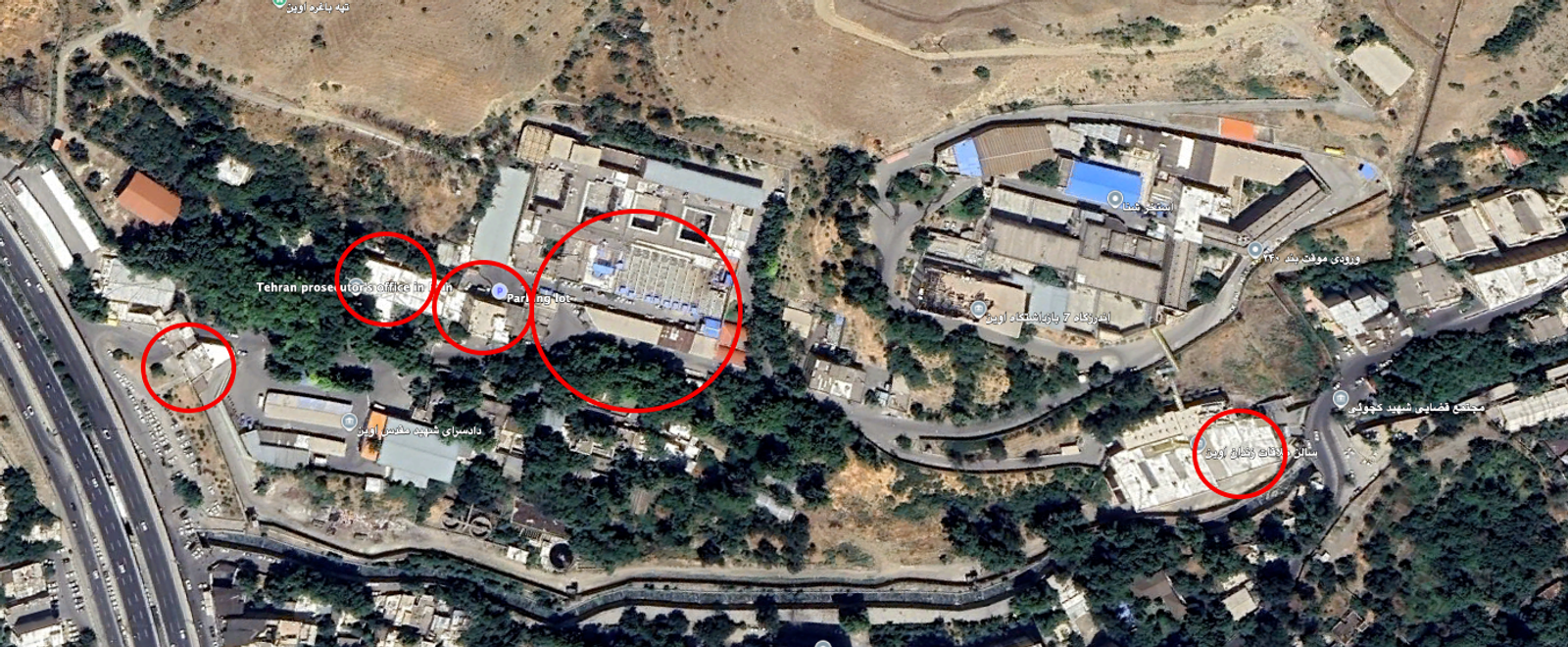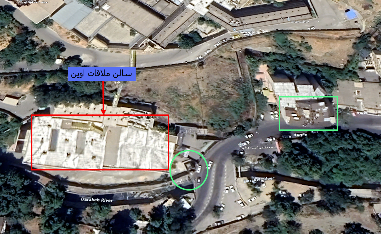 در تصویر هوایی گوگل هم می‌توانید محل قرار گیری این ساختمان‌ها نسبت به سالن ملاقات زندان اوین را که با دایره قرمز رنگ مشخص شده مشاهده کنید.