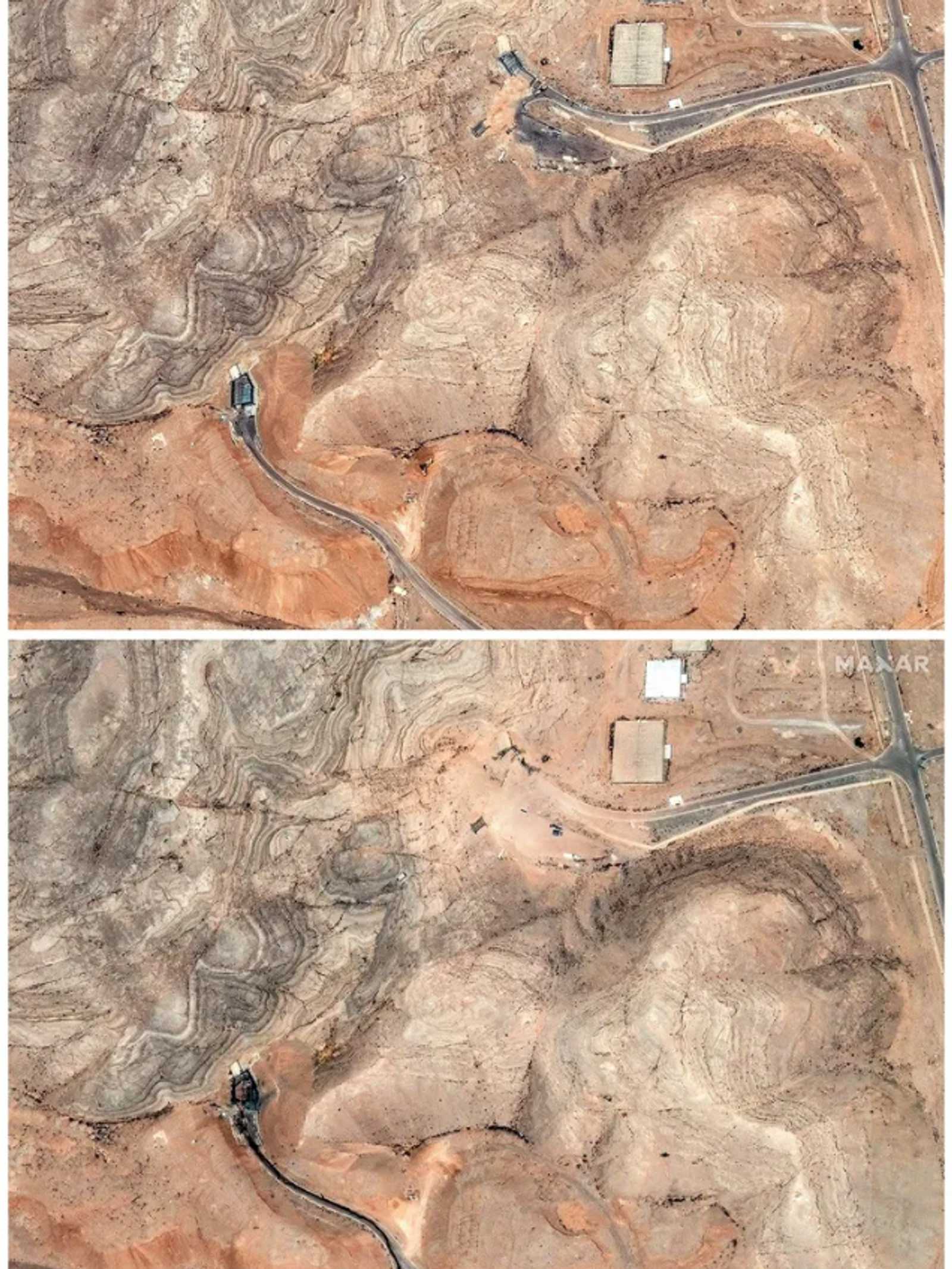 نمایی از ورودی تونلهای مرکز تحقیقات فناوری هستهای اصفهان پیش و پس از حملات هوایی آمریکا؛ ۳۰ خرداد (بالا) و اول تیر ۱۴۰۴ (پایین)