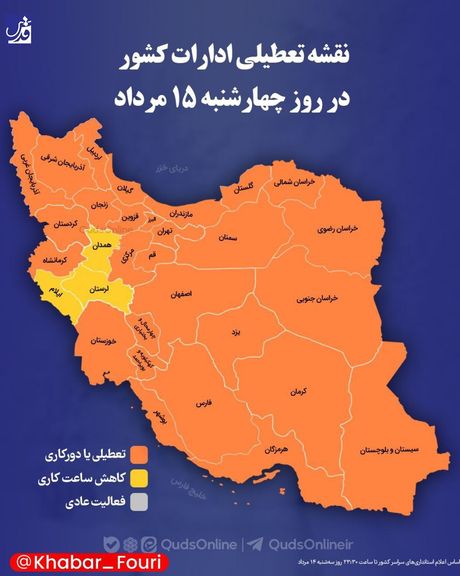همزمان با موج گرمای شدید و هشدارهای هواشناسی، استانداریهای ۲۸ استان کشور اعلام کردند که روز چهارشنبه ۱۵ مرداد، ادارات، بانکها و نهادهای دولتی تعطیل خواهند بود. تنها استانهای ایلام، همدان و لرستان مشمول این تعطیلی سراسری نشدهاند.