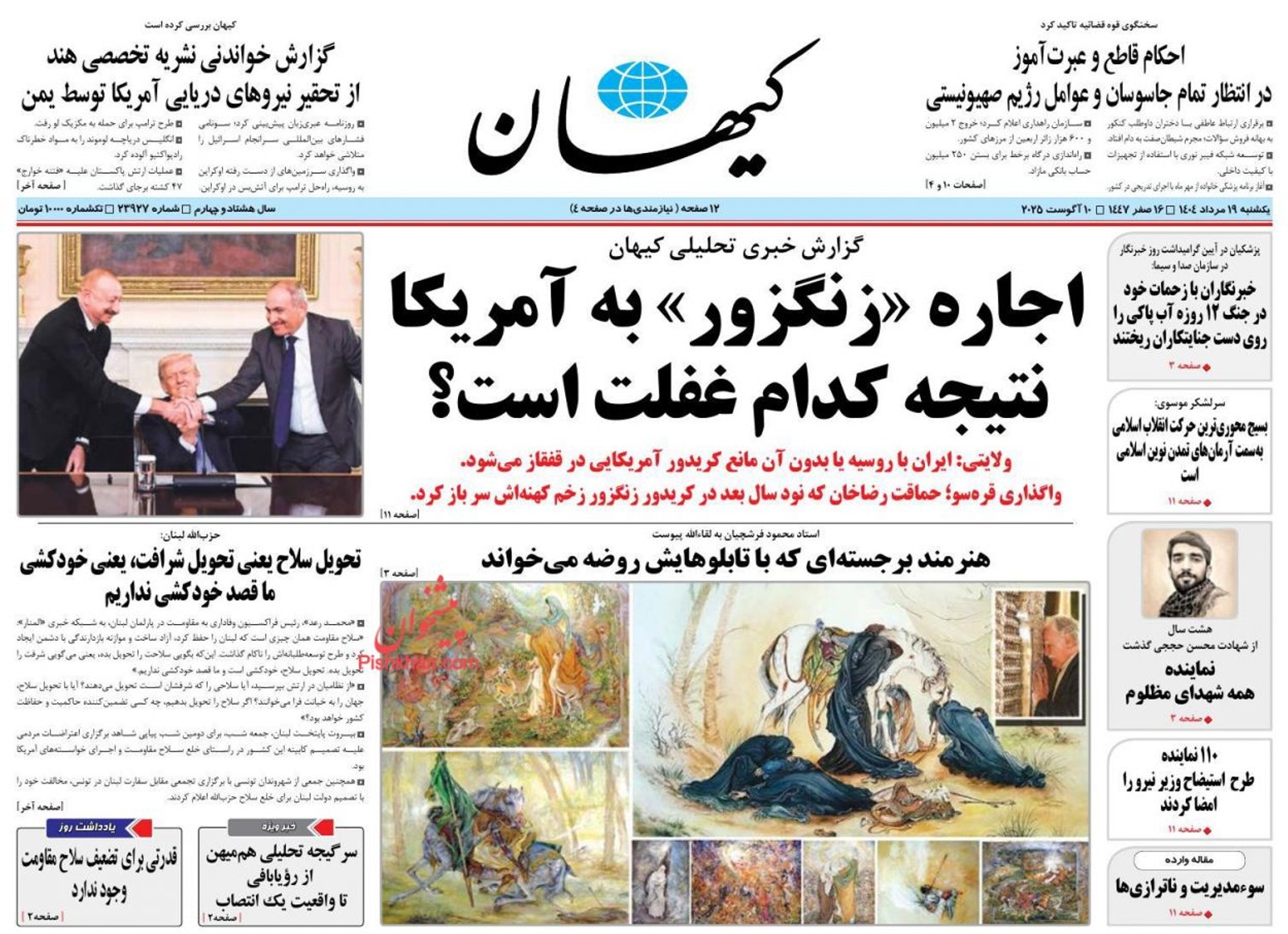 روزنامه کیهان، منسوب به خامنهای در گزارش اصلی شماره یکشنبه ۱۹ مرداد خود نوشت: جمهوری اسلامی، «چه با همراهی روسیه و چه بدون آن» در برابر هرگونه طرح ضدایرانی نظیر زنگزور، واکنشی قاطع و بازدارنده خواهد داشت.