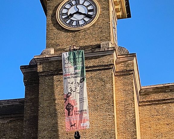 معترض ایرانی پرچم «آزادی برای ایران» را از برج ساعت یک ایستگاه لندن آویخت