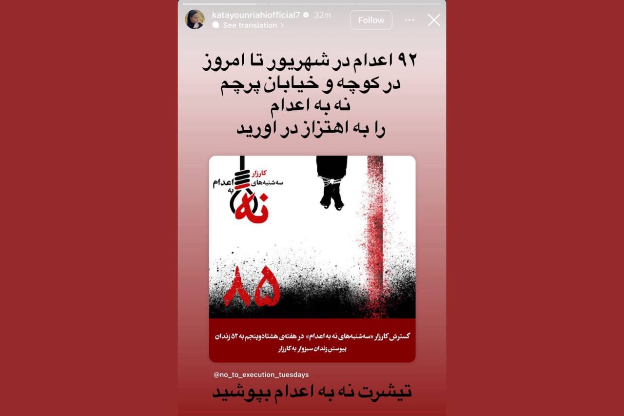 کتایون ریاحی، بازیگر سینما که پس از همراهی با جنبش «زن، زندگی، آزادی» بازداشت و سپس ممنوعالفعالیت شد، از کارزار «سهشنبههای نه به اعدام» حمایت کرد و از مردم خواست تا با پوشیدن تیشرت «نه به اعدام» و برافراشتن پرچم این شعار در کوچه و خیابان، به این کارزار بپیوندند.