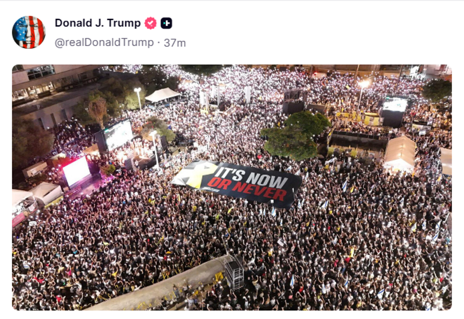 دونالد ترامپ، رییس‌جمهوری آمریکا، شنبه شب با انتشار عکسی از تجمع برگزارشده در میدان گروگان‌ها در تل‌آویو، از دولت اسرائیل خواست توافق پیشنهادی او برای پایان جنگ غزه و بازگرداندن گروگان‌ها را به اجرا بگذارد.