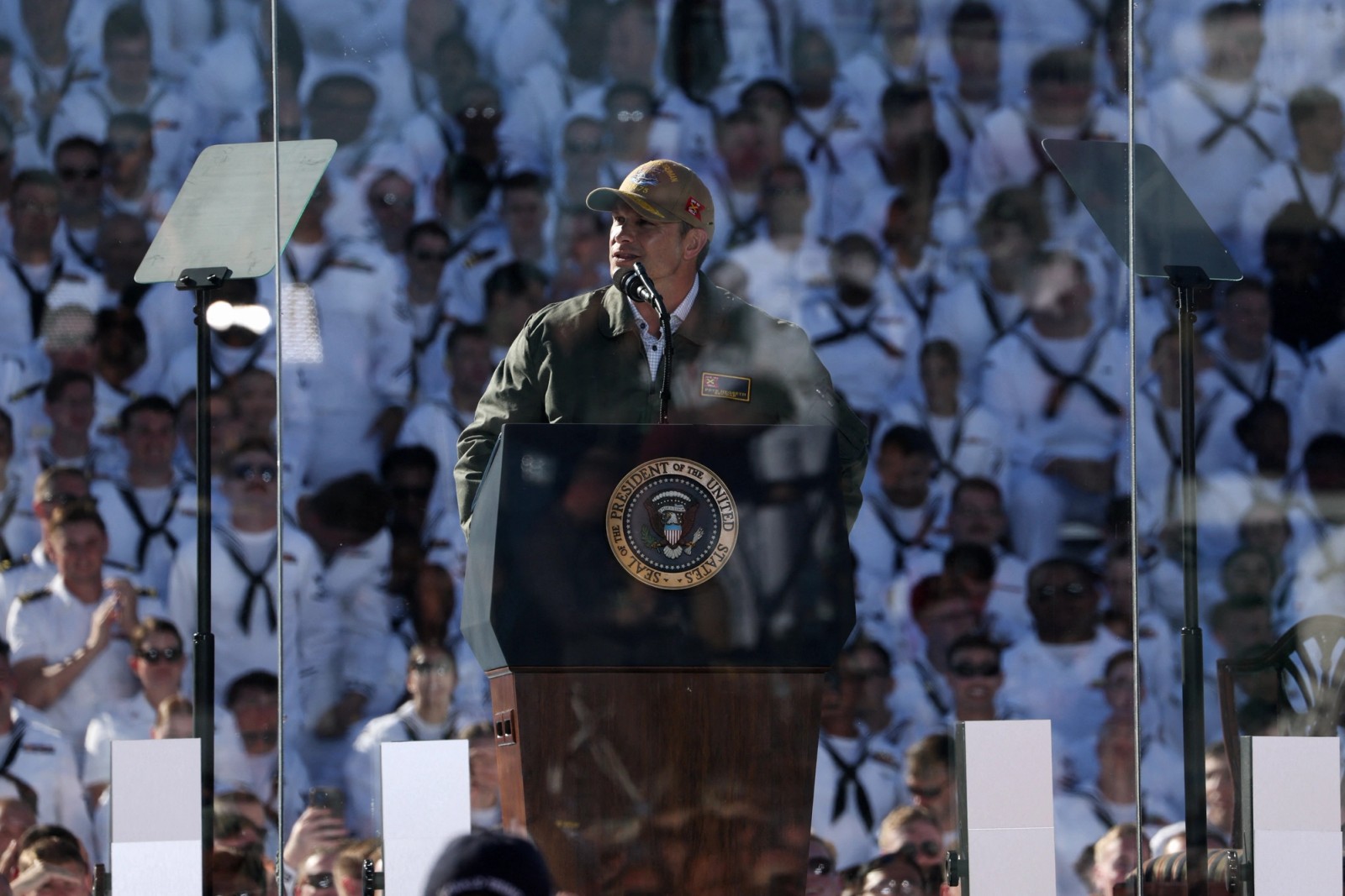 پیت هگست نیز در حضور هزاران ملوان و اعضای ارتش تاکید کرد که «برقراری صلح از طریق اقتدار» اولویت وزارت جنگ است و رییسجمهوری آمریکا به عنوان فرمانده کل قوا تضمین میکند که جنگاوران همه آنچه را برای بازدارندگی دشمنان نیاز دارند، در اختیار داشته باشند.