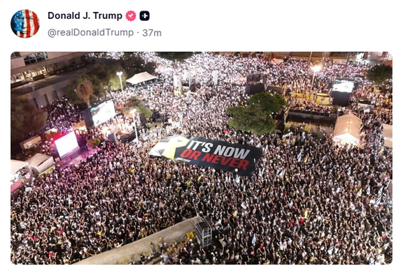 دونالد ترامپ، رییسجمهوری آمریکا، شنبه شب با انتشار عکسی از تجمع برگزارشده در میدان گروگانها در تلآویو، از دولت اسرائیل خواست توافق پیشنهادی او برای پایان جنگ غزه و بازگرداندن گروگانها را به اجرا بگذارد.