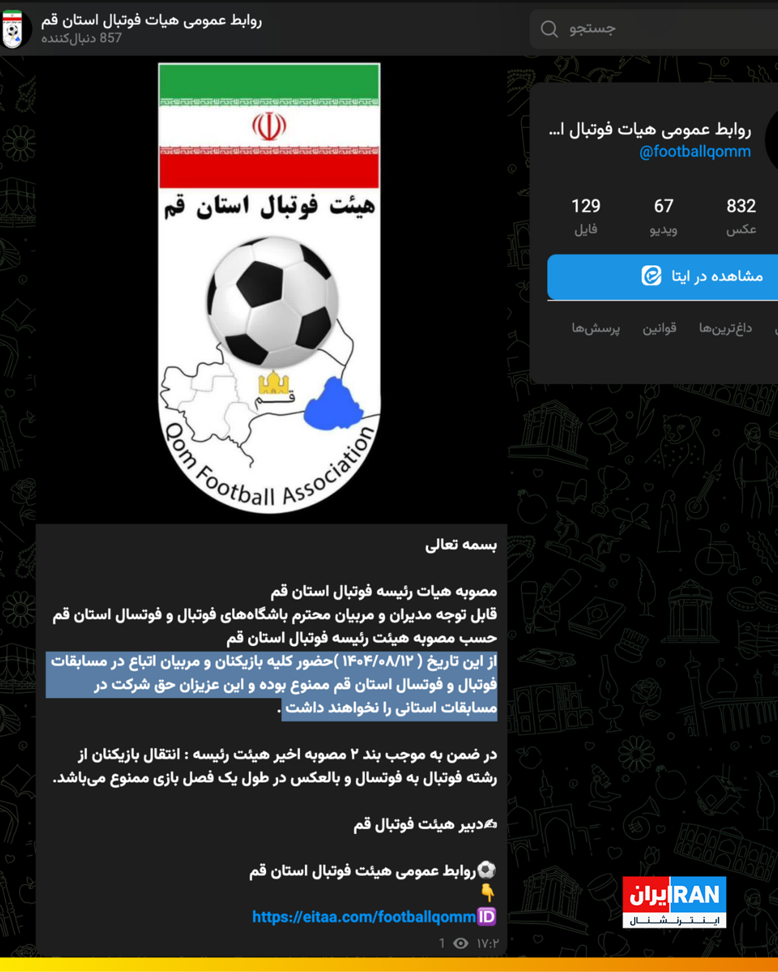 این تصمیم هیات فوتبال استان قم که در روز ۱۲ آبان، ۴ روز پس از این مسابقه مصوب شده، در روز ۱۴ آبان در کانال هیات فوتبال قم در پیام‌رسان ایرانی «ایتا» ابلاغ شده است.