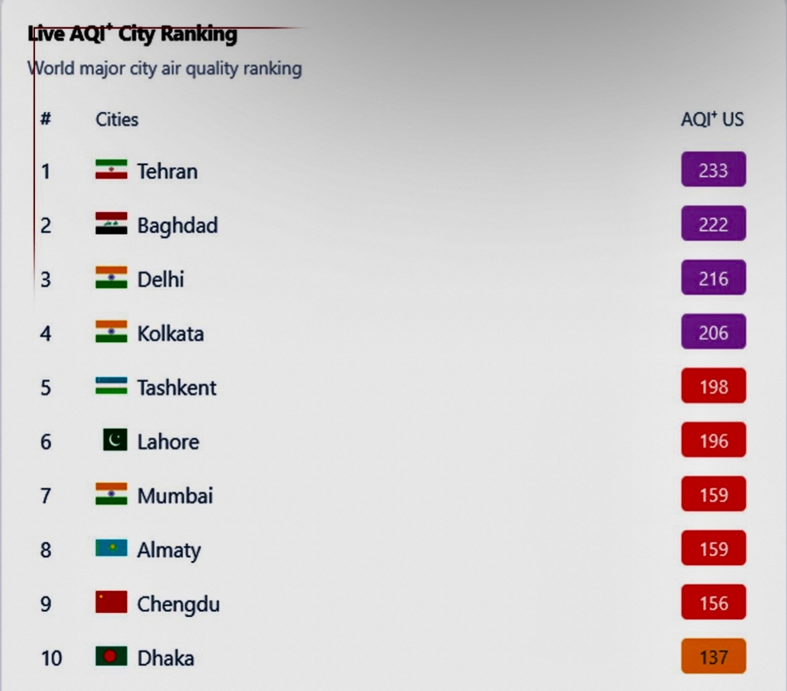 بر اساس جدول منتشر شده در وب‌سایت آی‌کیو ایر، صبح چهارشنبه بغداد عراق، آلماتی قزاقستان، چنگدو در چین و باکو در آذربایجان، دیگر شهرهای آلوده جهان تا رتبه دهم بودند.