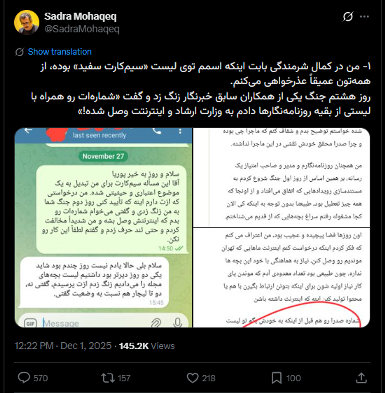 او نوشت در شرایط جنگی گزارش از «کشتهشدگان غیرنظامی جنگ» را به عنوان وظیفه خود تعیین کرده است و با توجه به قطعی اینترنت به گرفتن خط سفید تن داده است.