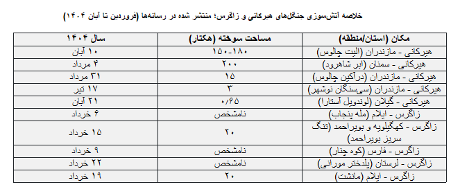 تا این لحظه نهتنها آمار دقیقی از میزان آتشسوزیهای اخیر منتشر نشده (تنها اطلاعات در دسترس در جدول زیر نمایش خلاصه شدهاند) که هیچ گزارش عمومی تجمیعشده و عدد دقیقی در دسترس نیست که نشان دهد «چند حریق» و «چند هکتار» از کل «جنگلهای هیرکانی و «جنگلهای زاگرس» در سال ۱۴۰۴ به خاکستر بدل شدند.