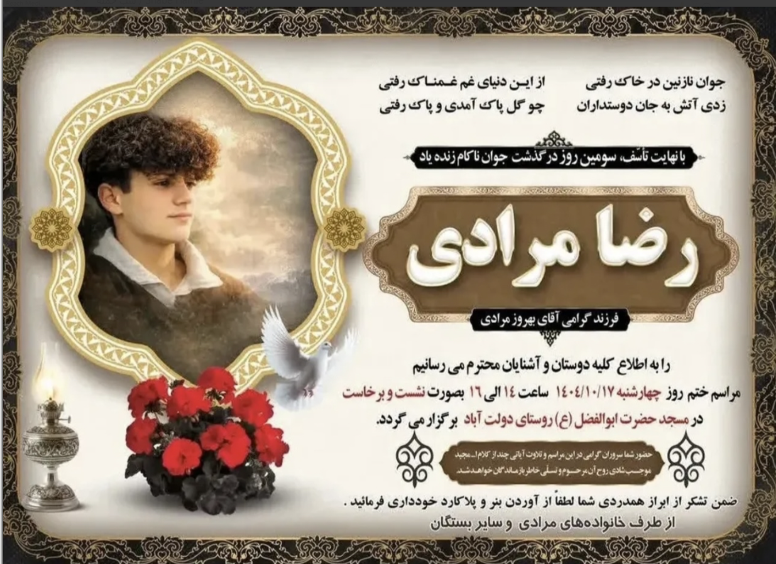 بر اساس اطلاعات رسیده به ایراناینترنشنال، پیکر رضا مرادی از طایفه عبدالوند، متولد ۱۳۸۷ و اهل ازنا در استان لرستان، بامداد سهشنبه ۱۶ دیماه، بین ساعت ۵ تا ۶ صبح، توسط افراد لباسشخصی و بدون حضور خانوادهاش به خاک سپرده شد.