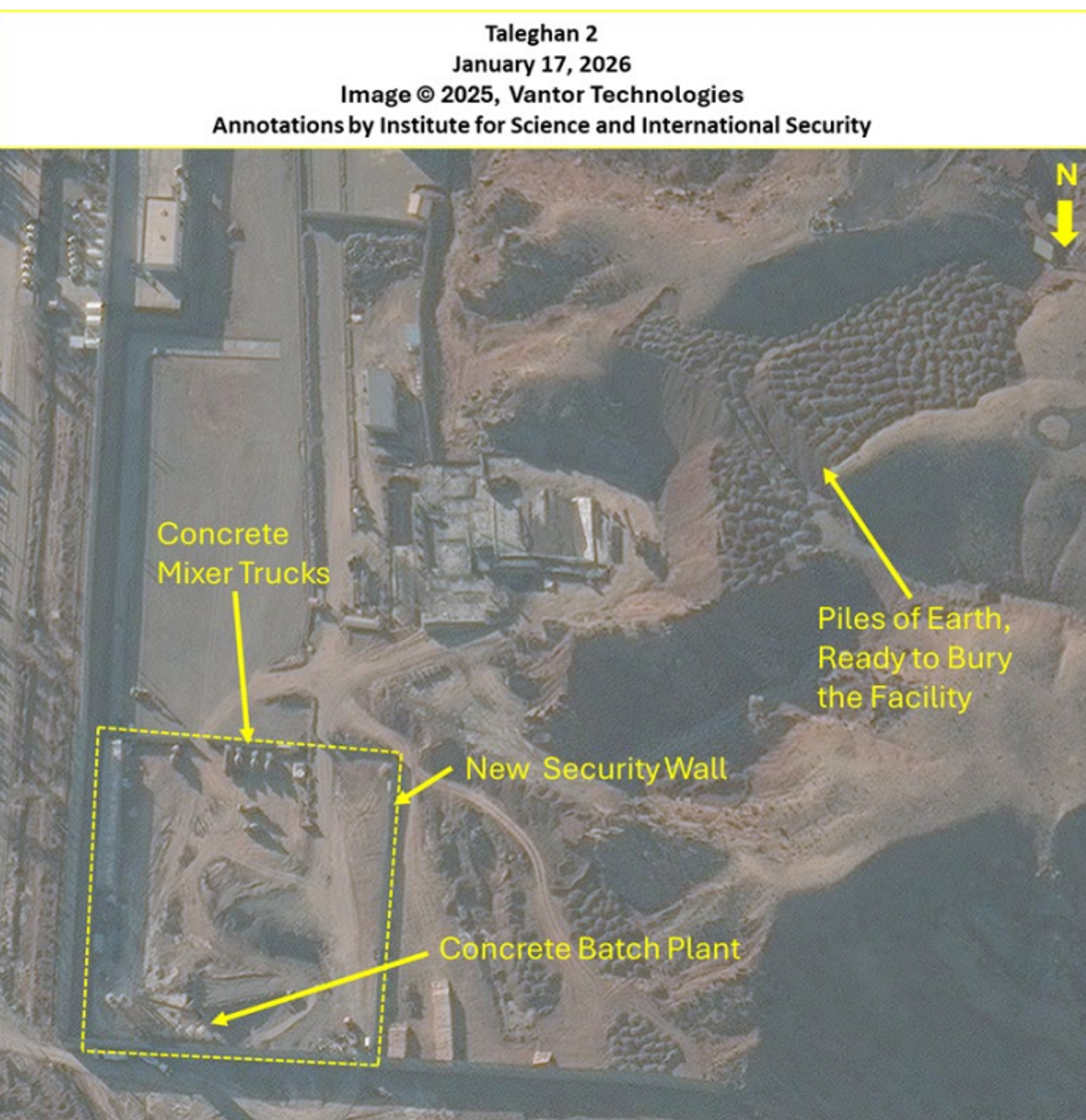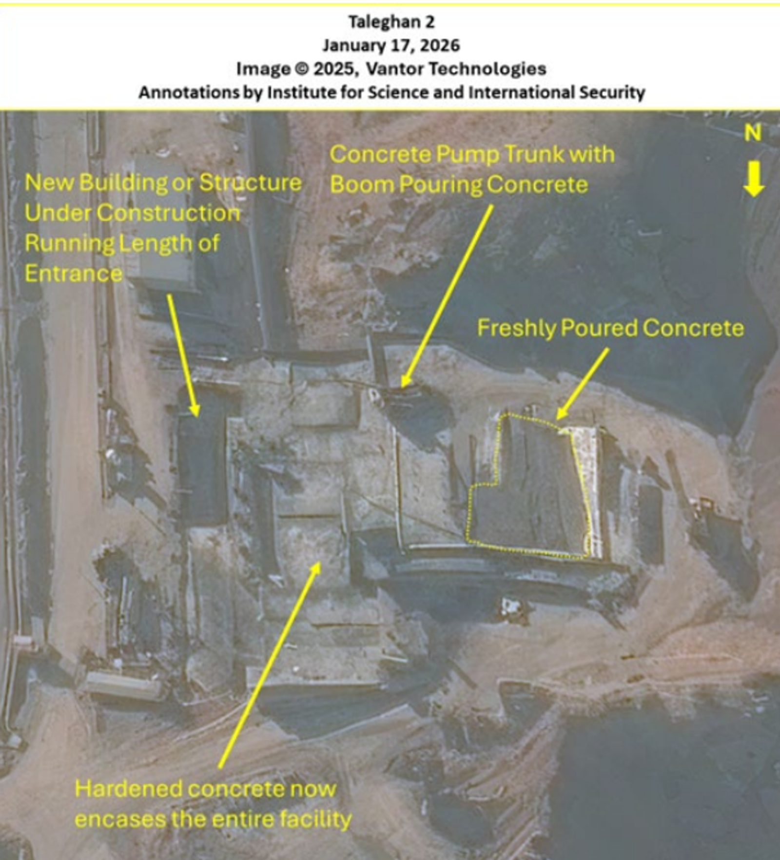 یک تصویر تطبیقی در این گزارش نشان می‌دهد محل سازه‌های دارای سقف قوسی‌شکل که در تصویر سمت چپ مربوط به ۲۴ نوامبر ۲۰۲۵ قابل مشاهده است، در تصویر سمت راست مربوط به ۱۷ ژانویه ۲۰۲۶ در زیر لایه بتنی قرار گرفته و تاسیسات اصلی اکنون به‌طور کامل در زیر پوسته بتنی پنهان شده است.
