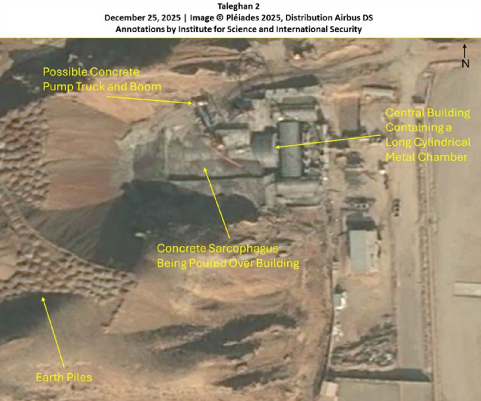 در به‌روزرسانی پیشین تصاویر ماهواره‌ای که اوایل ژانویه ۲۰۲۶ منتشر شده بود، مشخص شد که تا ۲۵ دسامبر ۲۰۲۵، ساختمان اصلی طالقان ۲ با سقف فلزی قوسی‌شکل، که یک محفظه استوانه‌ای شبیه به اتاق آزمایش مواد منفجره قوی را در خود جای داده، در حال پوشانده شدن با بتن است.