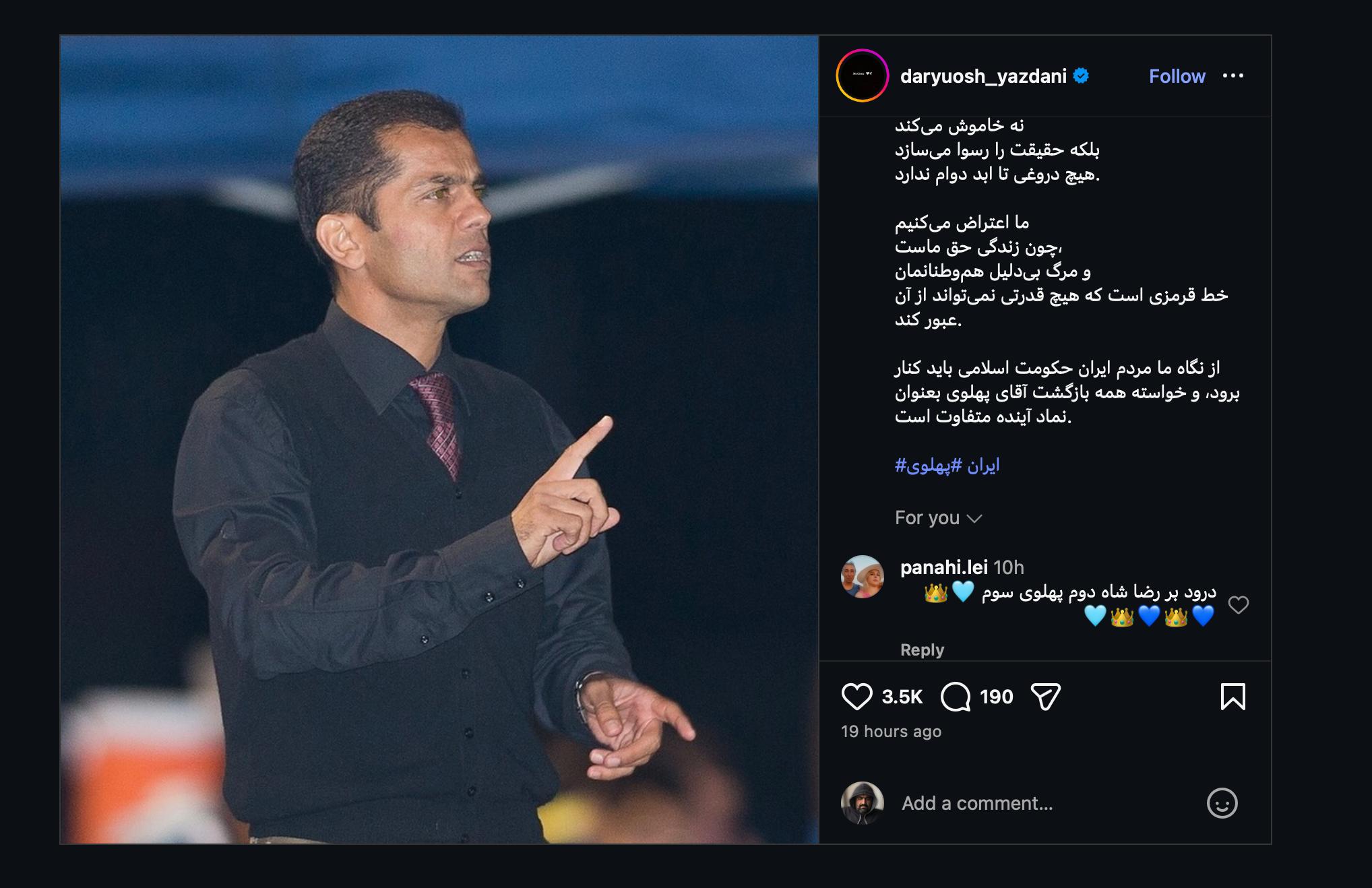 داریوش یزدانی، بازیکن پیشین استقلال و تیم ملی فوتبال ایران، در اینستاگرام خود ضمن حمایت از انقلاب ملی ایرانیان، در واکنش به کشتار بیسابقه مردم بهدست جمهوری اسلامی نوشت: «از نگاه مردم ایران حکومت اسلامی باید کنار برود و خواسته همه بازگشت آقای پهلوی بعنوان نماد آینده متفاوت است.»