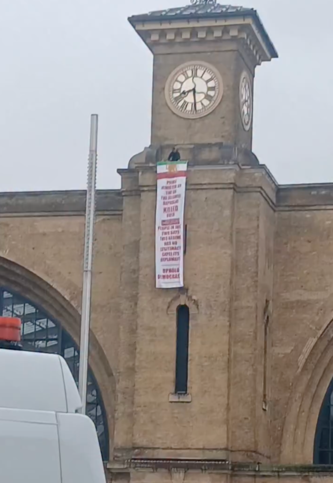 یک شهروند ایرانی روز جمعه ۱۰ بهمن با رفتن به بالای ساختمان ایستگاه قطر «کینگز کراس» لندن، بنری اعتراضی خطاب به کییر استارمر، نخستوزیر بریتانیا، برافراشت.