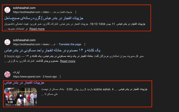 بررسیهای ایراناینترنشنال نشان میدهد وبسایت روزنامه محلی صبح ساحل در بندرعباس شنبه ۱۱ بهمن و ساعاتی پس از وقوع انفجار ویدیویی با عنوان «جزییات-انفجار-در-بندرعباس» را در این آدرس منتشر کرده است.