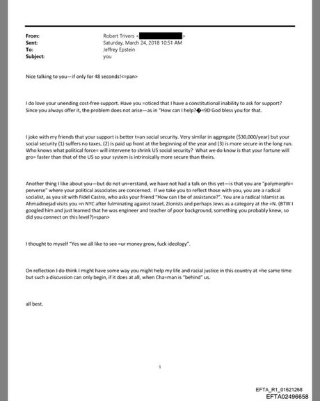 تریورز در این نامه همچنین اپستین را فردی توصیف کرده که در ارتباطات سیاسی و اجتماعیاش «چندچهره» است و میتواند همزمان با شخصیتهایی از طیفهای کاملا متضاد ایدئولوژیک ارتباط داشته باشد.