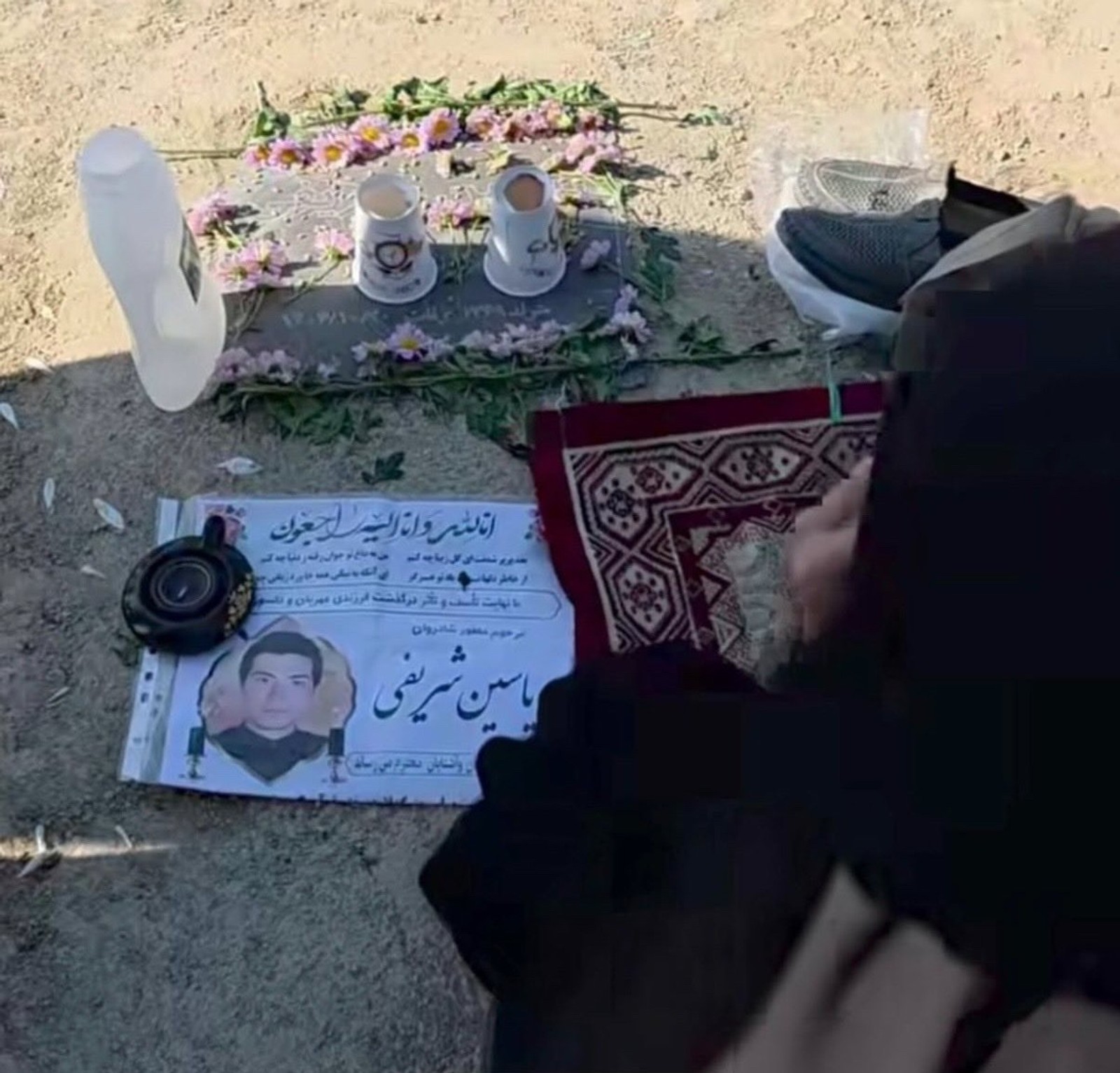 ‏تصویر منتشر شده در رسانه‌های اجتماعی، سوگواری غریبانه مادر جاویدنام یاسین شریفی را بر سر مزار او نشان می‌دهد.