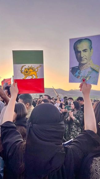 یکی از زنان در این مراسم تصویری از محمدرضاشاه پهلوی و پرچم را همزمان در دست دارد.
