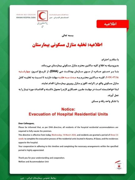 همچنین به کارکنانی که در خانههای سازمانی بیمارستان سکونت داشتند، تنها یک هفته مهلت داده شده است تا این واحدها را تخلیه کنند. پیشتر نیز خانههای سازمانی مرتبط با سرپرستی مدارس ایرانی در دبی تخلیه شده بود.