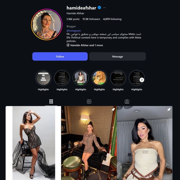 صفحه او از ۳۱ ژانویه (۱۱ بهمن) از دسترس خارج شد و اکنون به نظر می‌رسد وب‌سایت برند لباس او به نام «پوشاک افشار» هک شده است. در وب‌سایت او تصویری از شاهزاده رضا پهلوی با این جمله دیده می‌شود: «می‌نویسم تا به خاطر داشته باشی: تا ابد جاوید شاه».