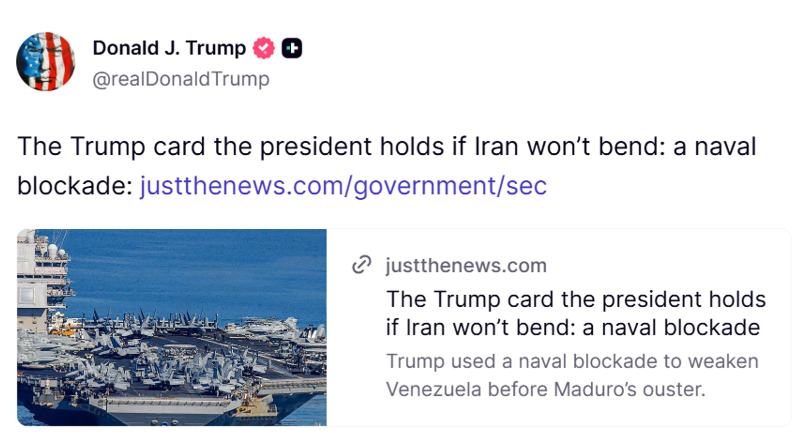 دونالد ترامپ، رییس‌جمهوری آمریکا، مقاله‌ای را در شبکه اجتماعی تروث‌سوشال بازنشر کرد که در آن آمده است در صورت عدم عقب‌نشینی حکومت ایران از مواضع خود، گزینه «محاصره دریایی» می‌تواند در دستور کار قرار گیرد.