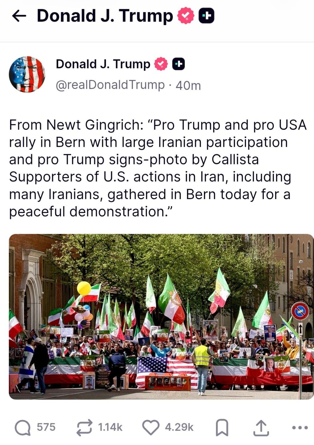 دونالد ترامپ، رییس‌جمهوری آمریکا، در تروث‌سوشال عکسی از تجمع ایرانیان در برن سوییس در حمایت از اقداماتش علیه جمهوری اسلامی را بازنشر کرد.