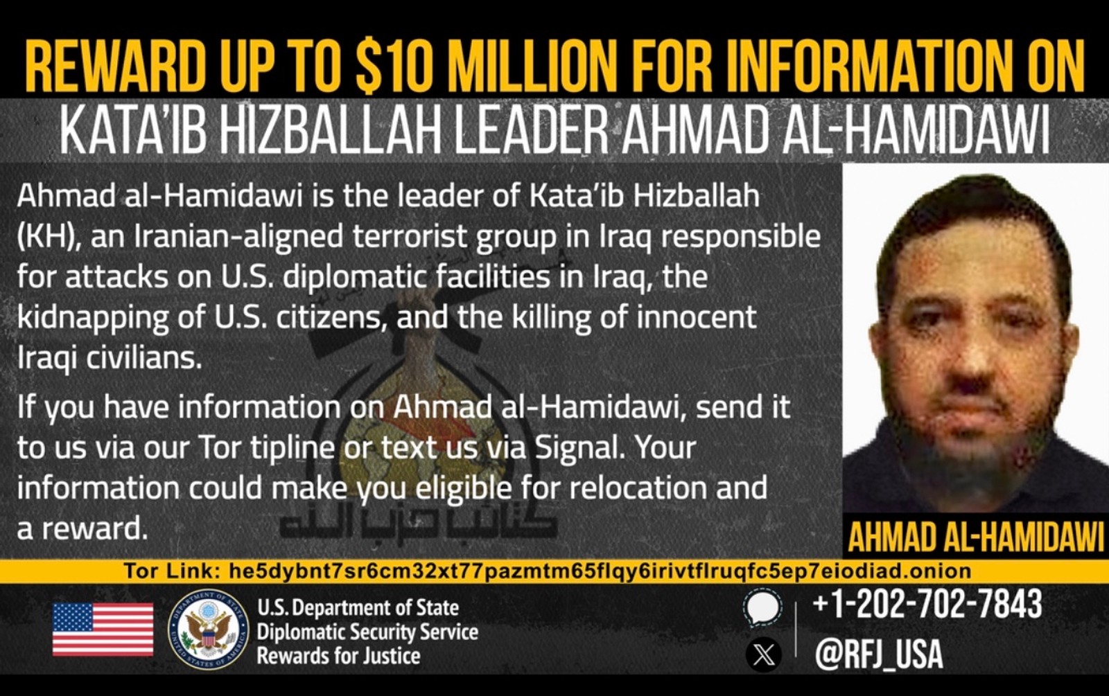 وزارت امور خارجه ایالات متحده در بیانیه‌ای اعلام کرد که برای احمد حمیداوی، رهبر کتائب حزب‌الله عراق تا سقف ۱۰ میلیون دلار جایزه تعیین کرده است.