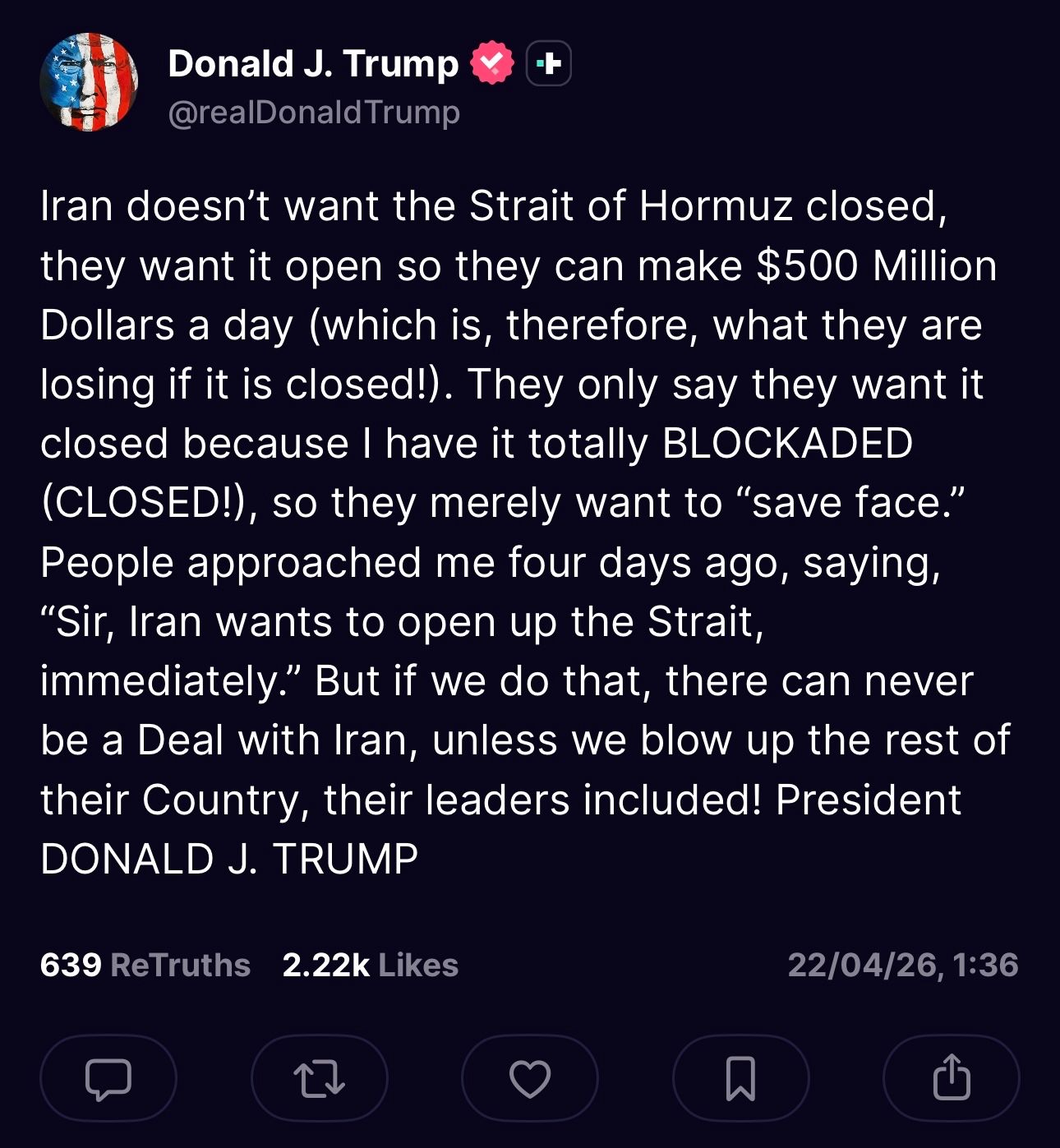 دونالد ترامپ، رییس‌جمهوری آمریکا، پس از آنکه از تمدید آتش‌بس با جمهوری اسلامی خبر داد، در پستی دیگر در شبکه اجتماعی تروث‌سوشیال نوشت: «ایران نمی‌خواهد تنگه هرمز بسته شود؛ آنها می‌خواهند باز باشد تا روزانه ۵۰۰ میلیون دلار درآمد کسب کنند (که در صورت بسته بودن، همین مقدار را از دست می‌دهند!). آنها فقط به این دلیل می‌گویند می‌خواهند تنگه بسته باشد که من آن را کاملا محاصره کرده‌ام (بسته‌ام!) بنابراین صرفا می‌خواهند آبرویشان را حفظ کنند.»