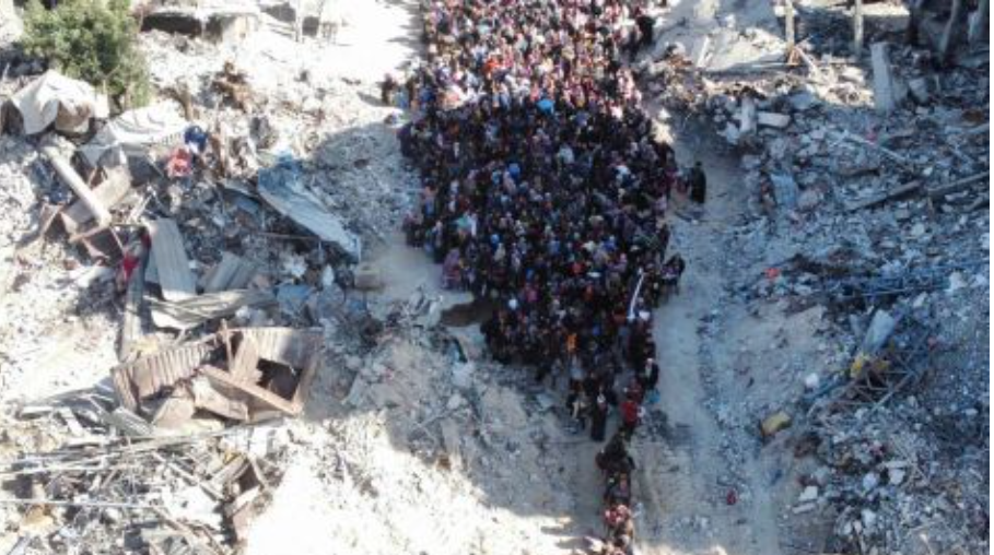 تصاویری که پهپادهای ارتش اسرائیل از خروج این جمعیت گرفتهاند، نشان میدهد فلسطینیها از کنار ساختمان های بمباران شده اردوگاه اسکورت می شوند.